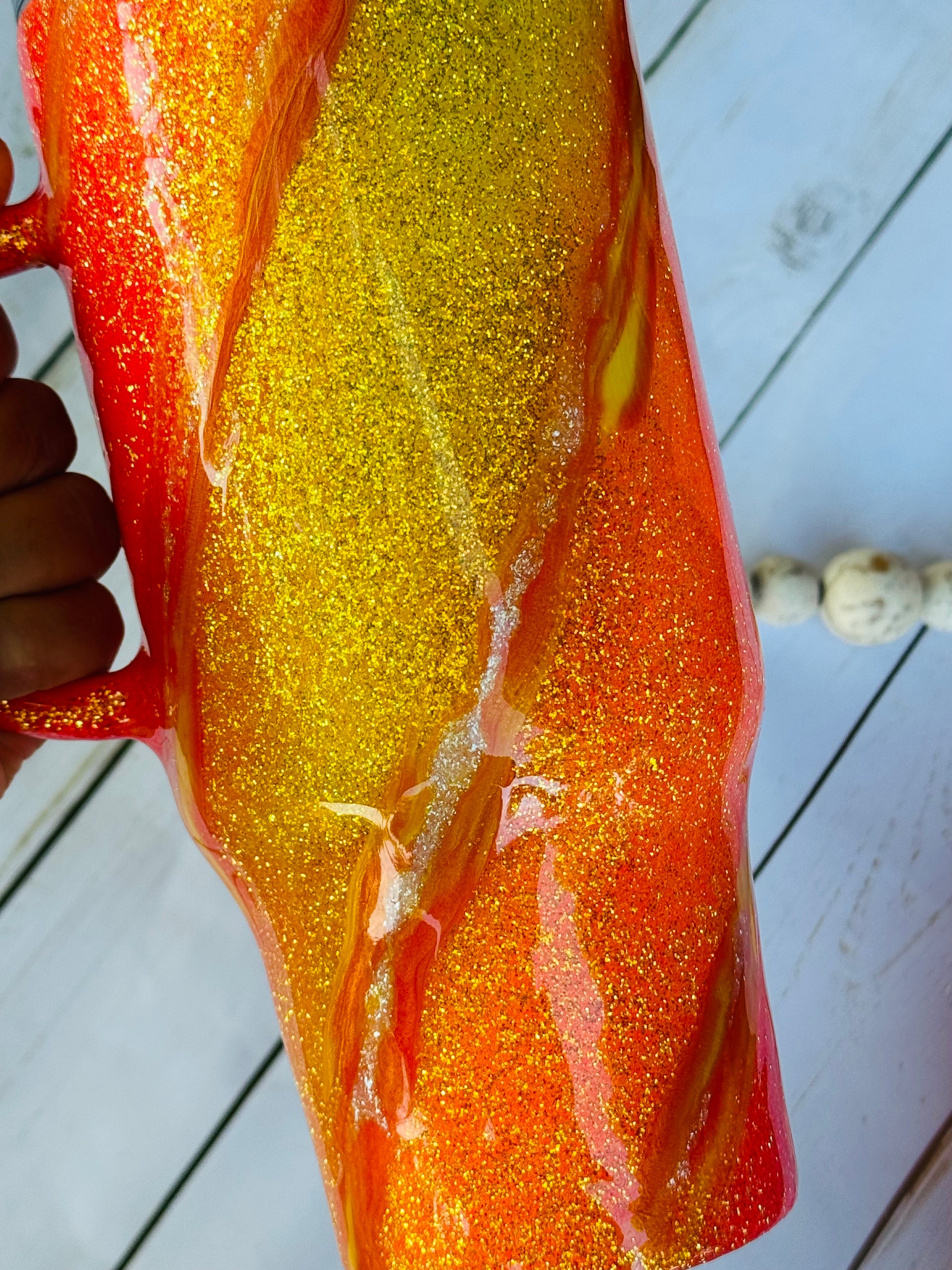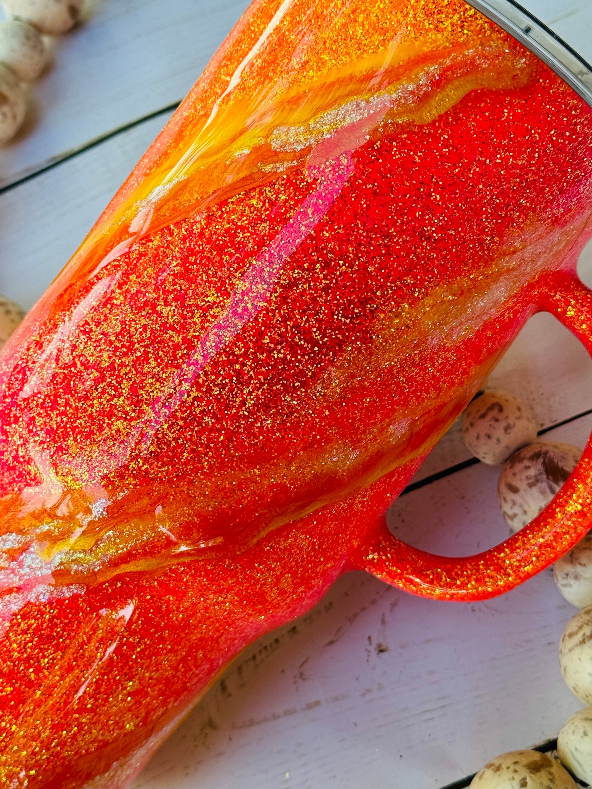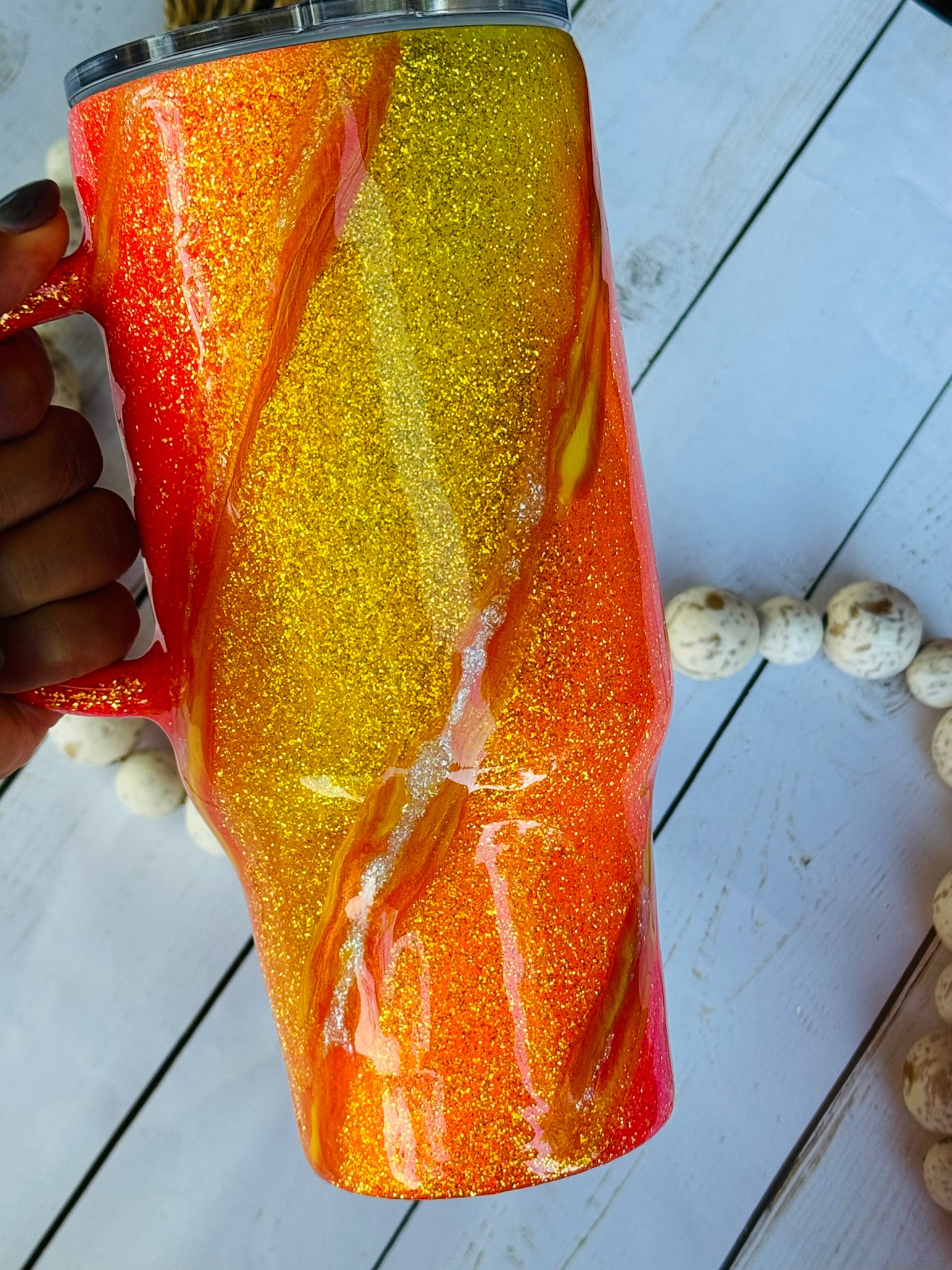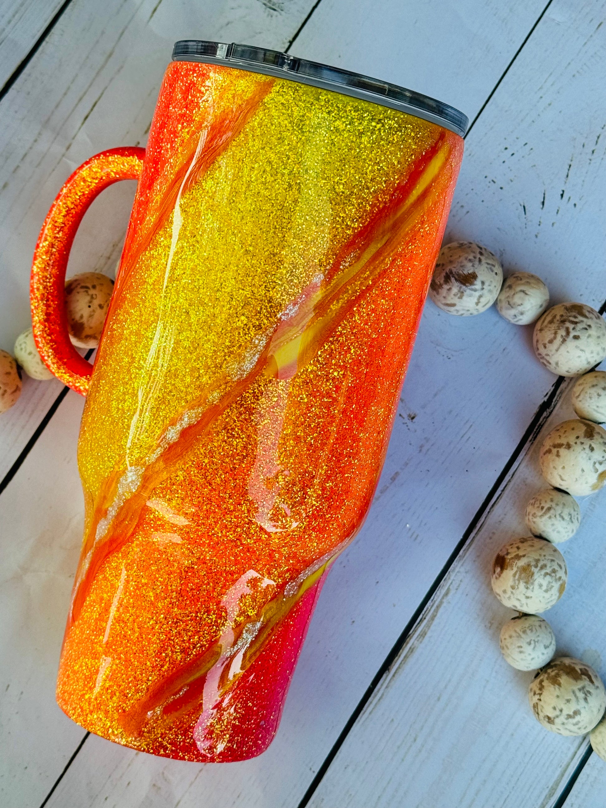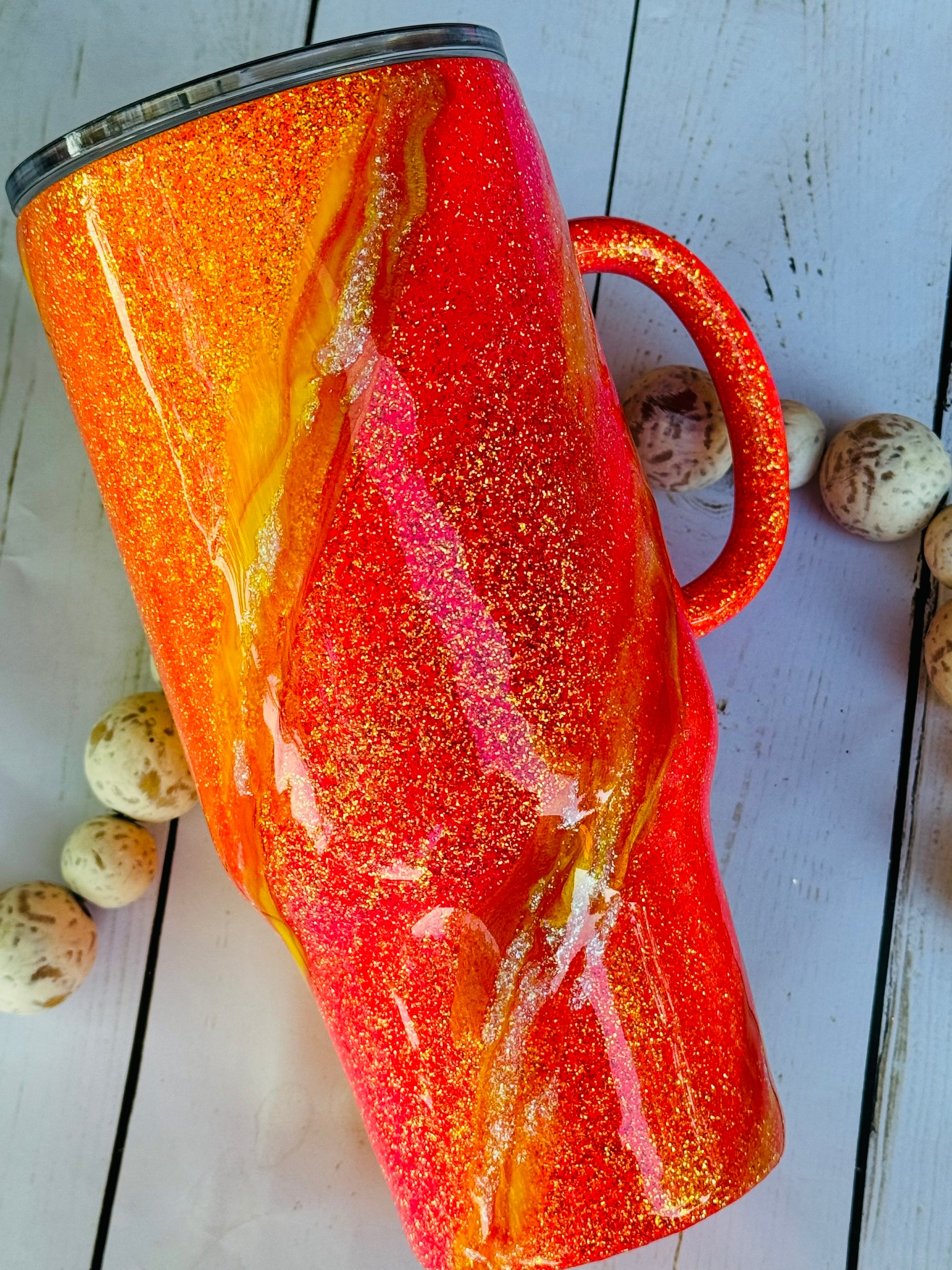 This handled gem is 32oz of pure shine snd sparkle!! I love the dimension and when its in the sun it hits perfectly!! Hot coffee or 32 oz of cold beverage to hydrate you all day!!! Grab this one of a kind tumbler today!!