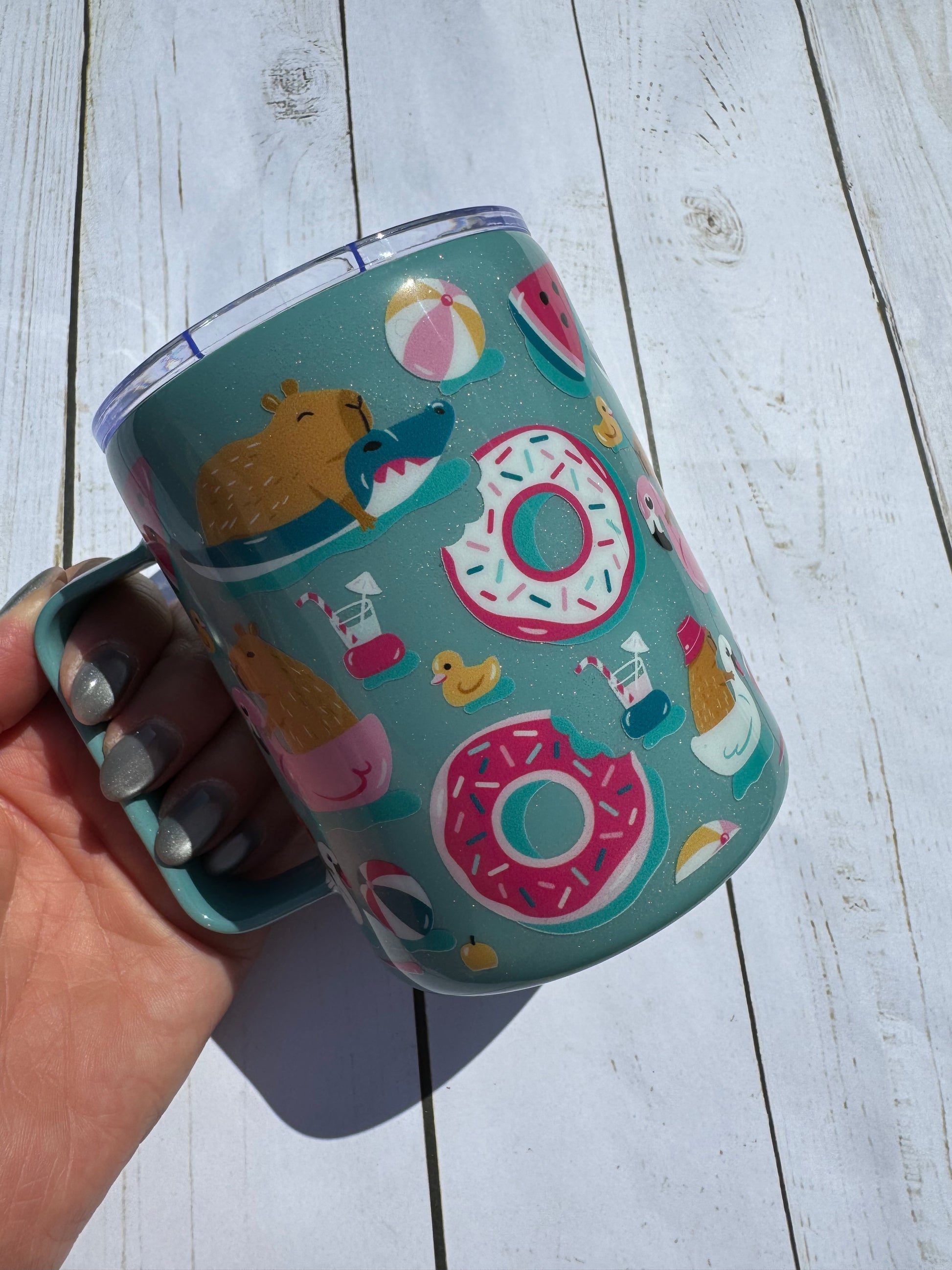 This cute Capybara swim mug is the perfect edition to any mug lovers collection! With a comfortable handle and a lid, this is perfect for any occasion!!! !2 oz camper mug!!