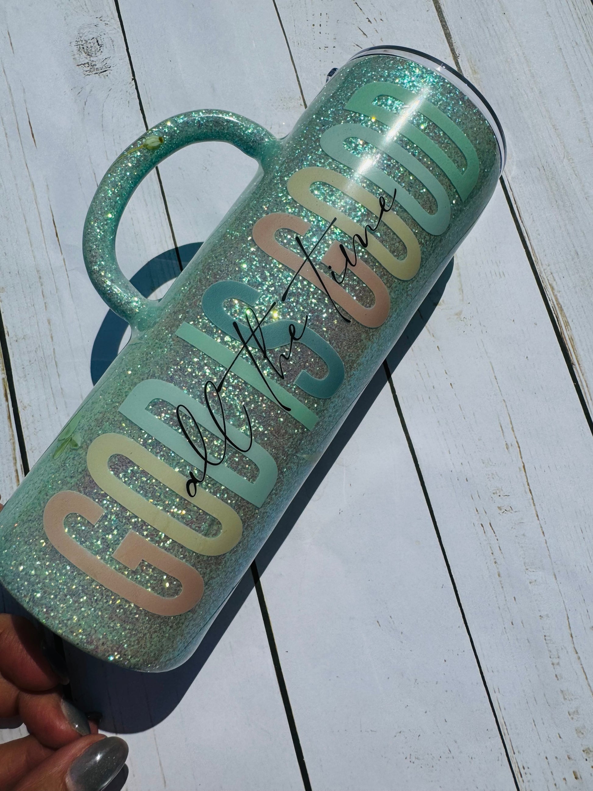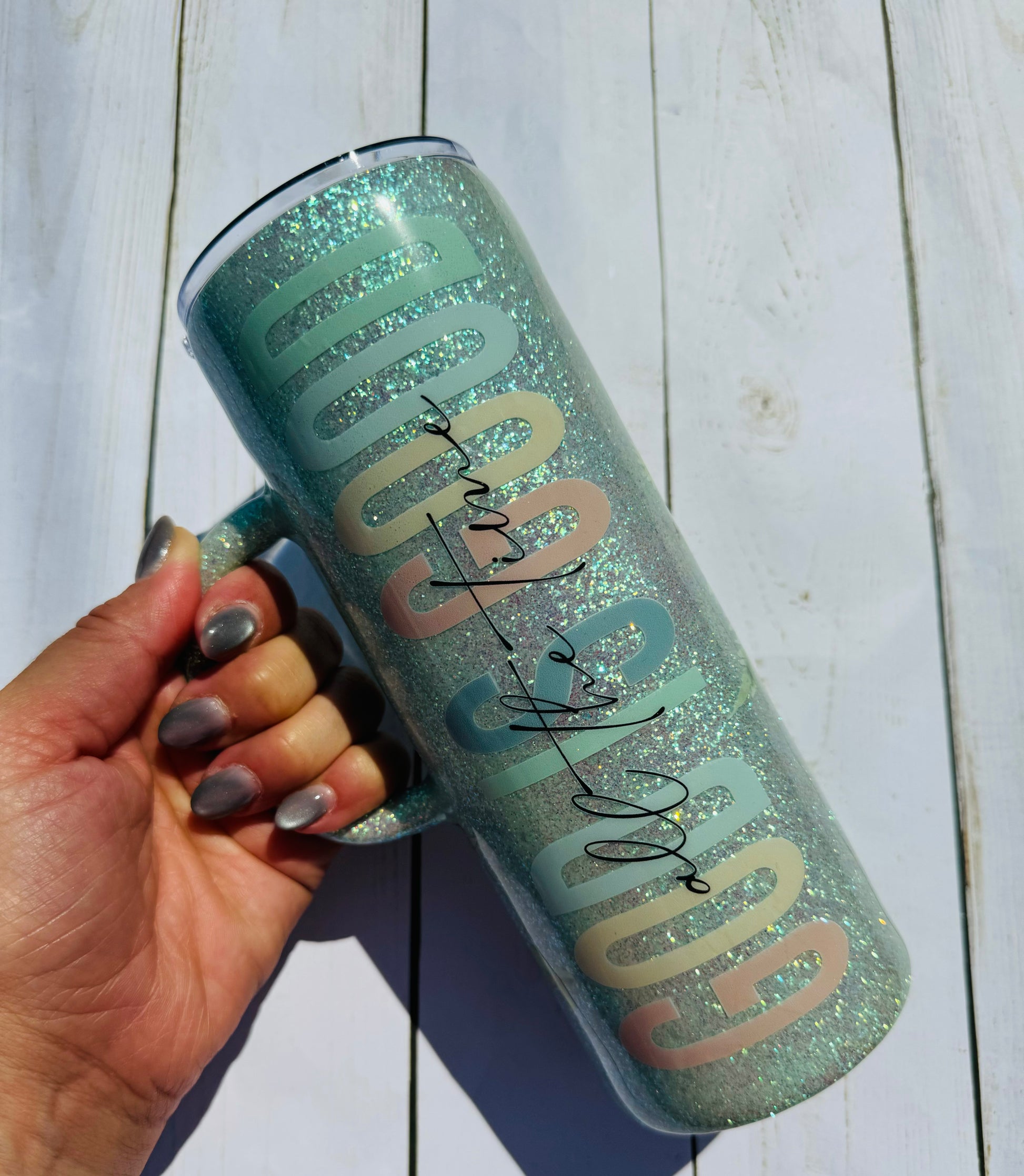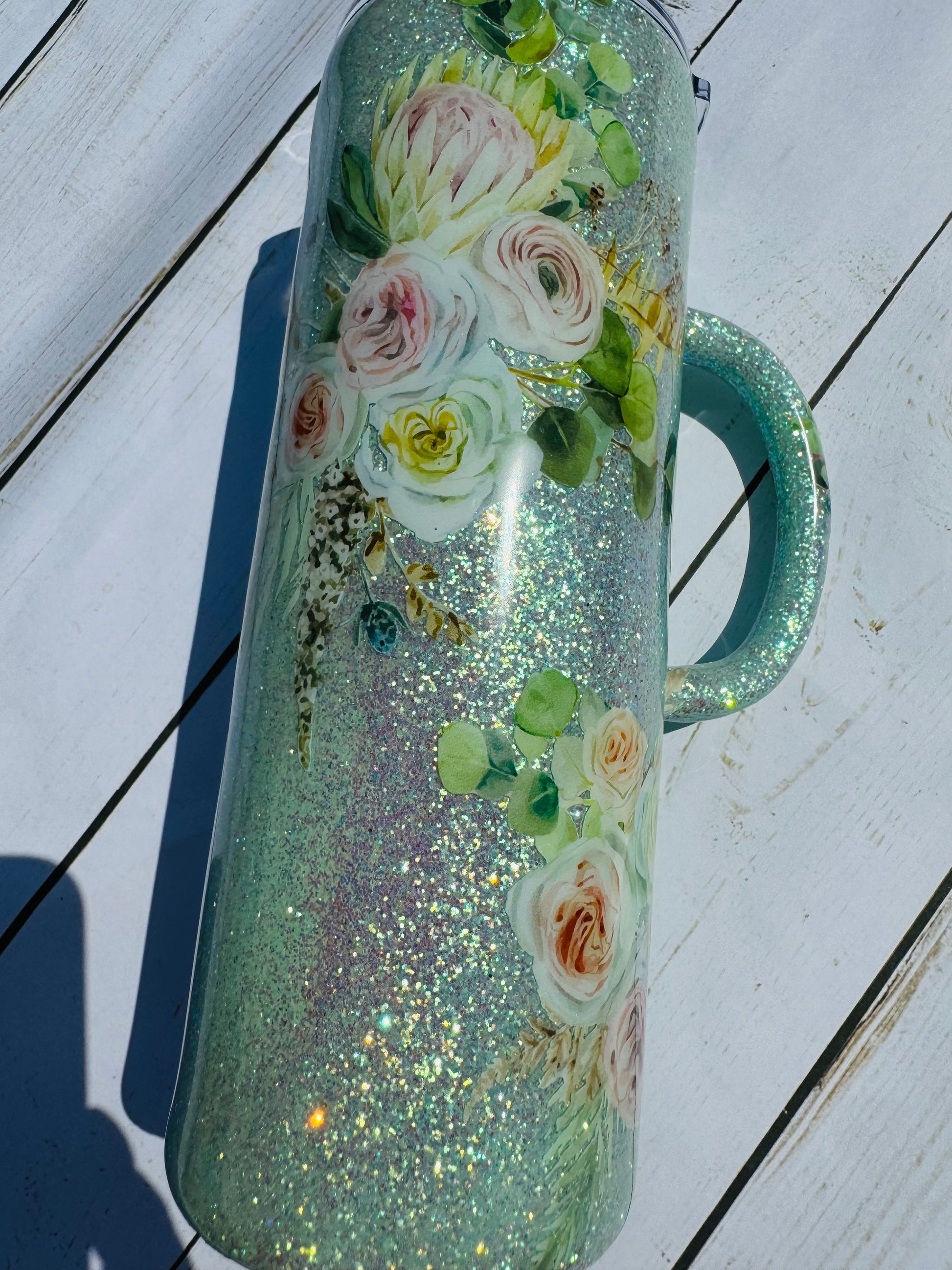 This is a handled 240z skinny tumbler ! Now the coveted skinny got even better with a handle!! Fitting in moist car cup holders and includes a straw! Show up to every function in style with this cute floral and inspirational duo.