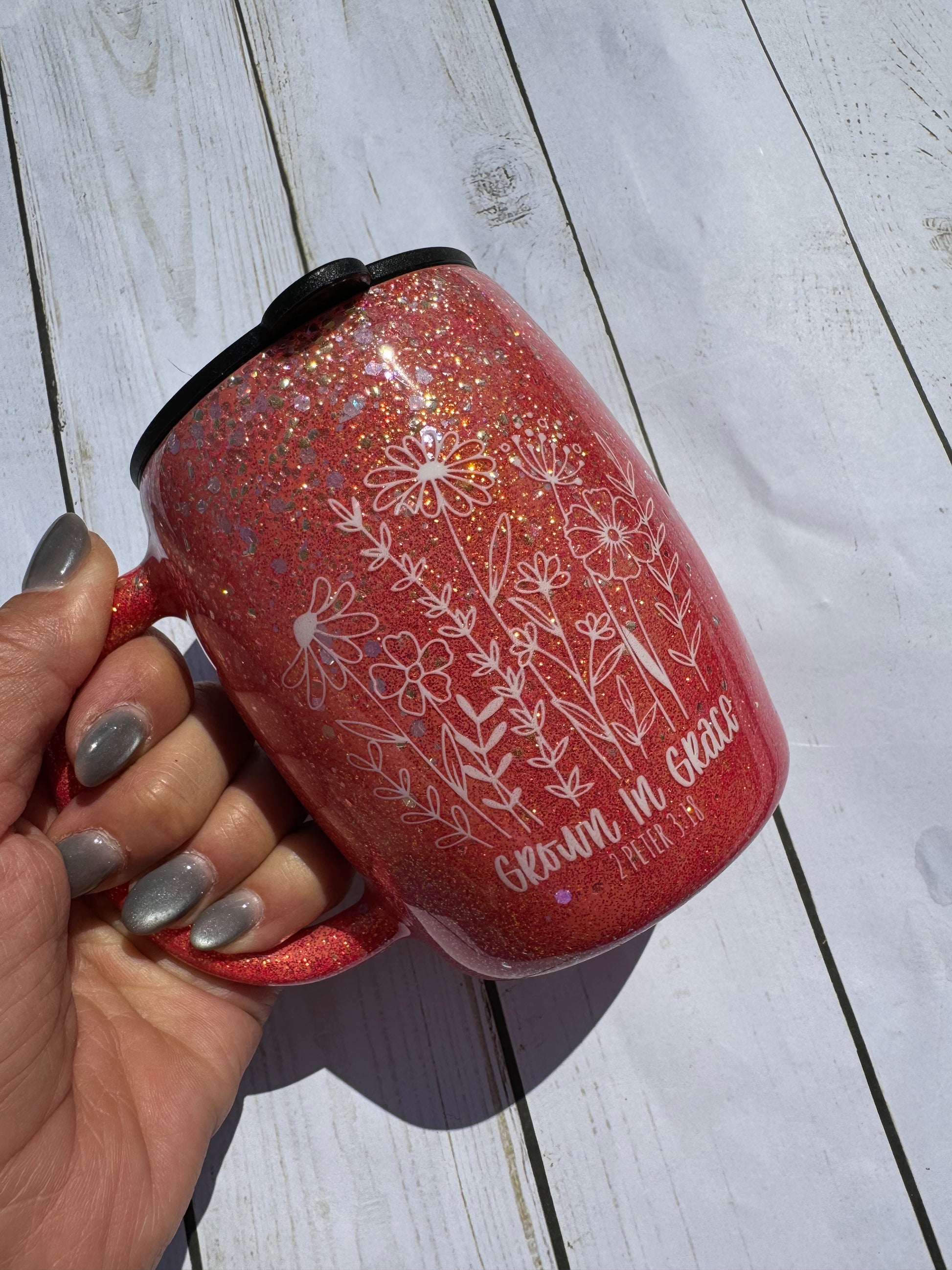 14 oz handled mug that has one of my favorite lids!! I love this bright coral for summer but this mug is versatile and can be used all year round!!!