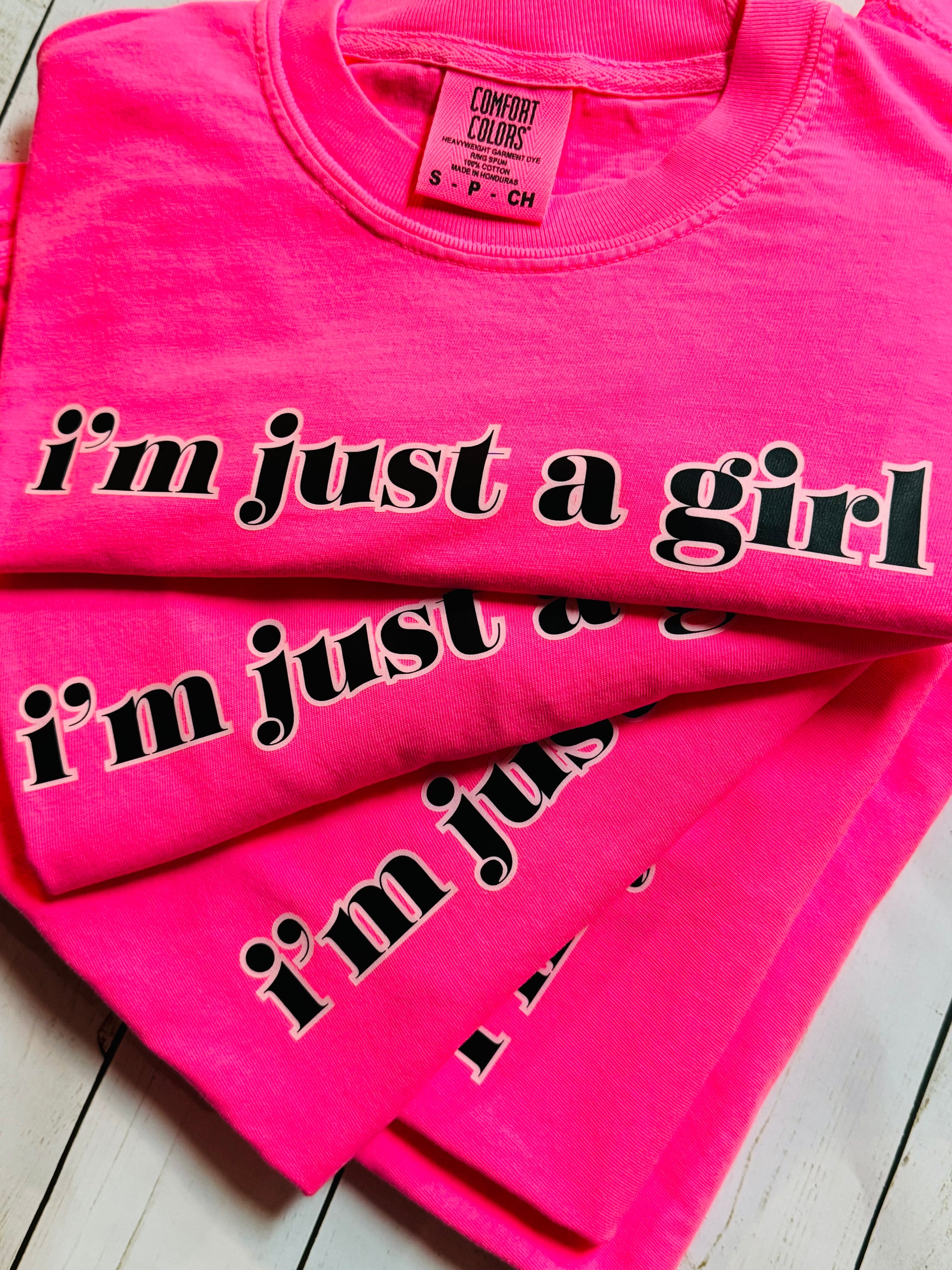 I'm just a girl......of course ! This is the brightest and stretchy fabric from comfort colors! I love this burst of bright pink!!!! Grab this one before it's gone!