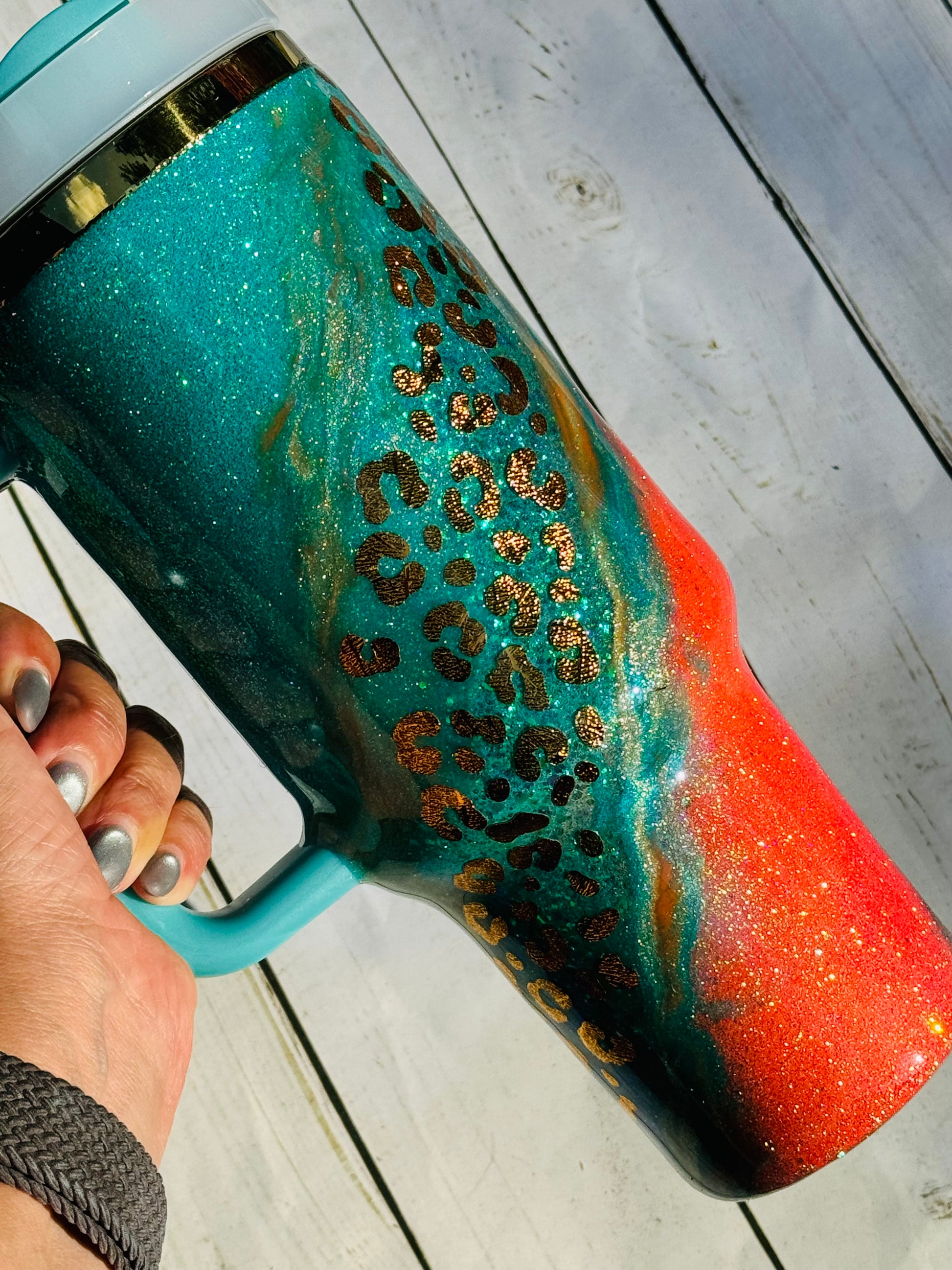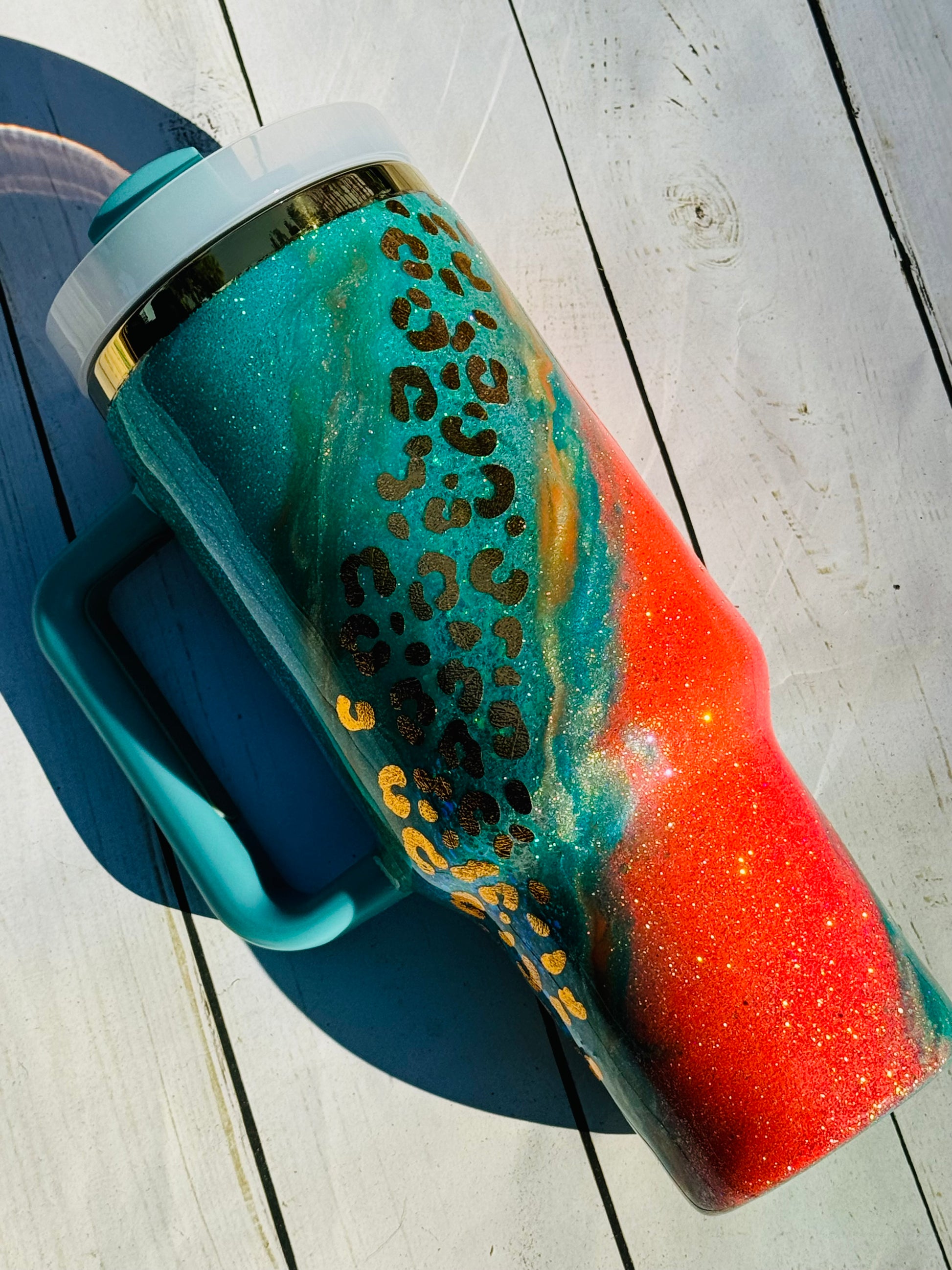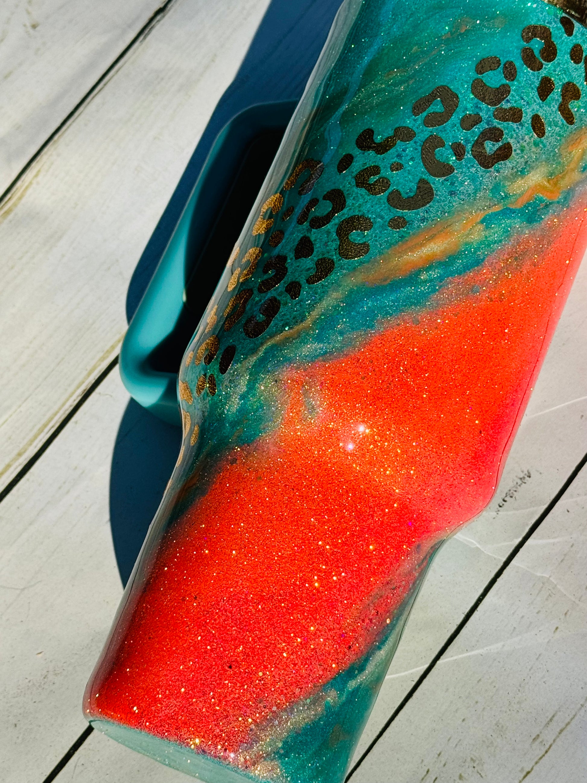 Teal greens and corals! splashed with sparkle and leopard prints! this comes with a straw and lid that slides and sips also!! grab this one of a kind tumbler and stay hydrated!!