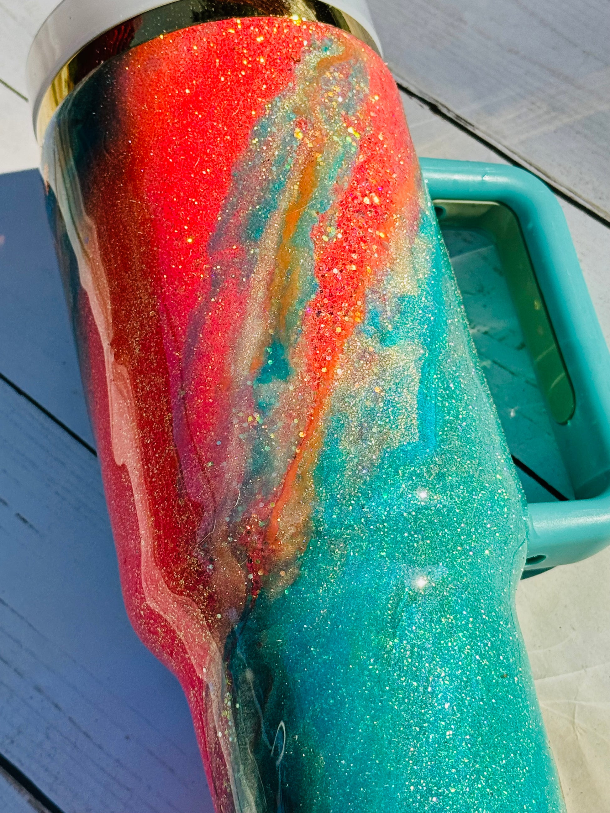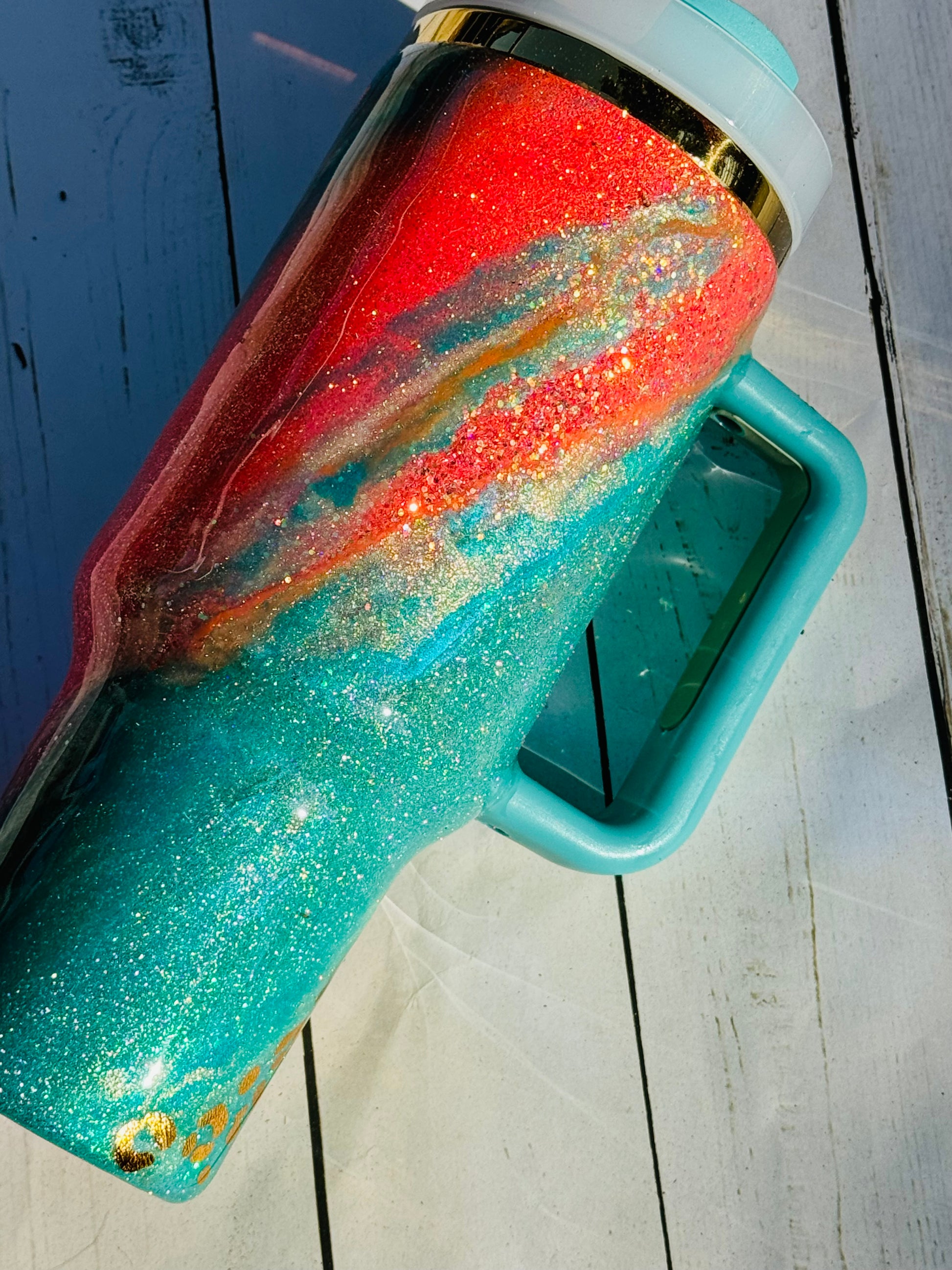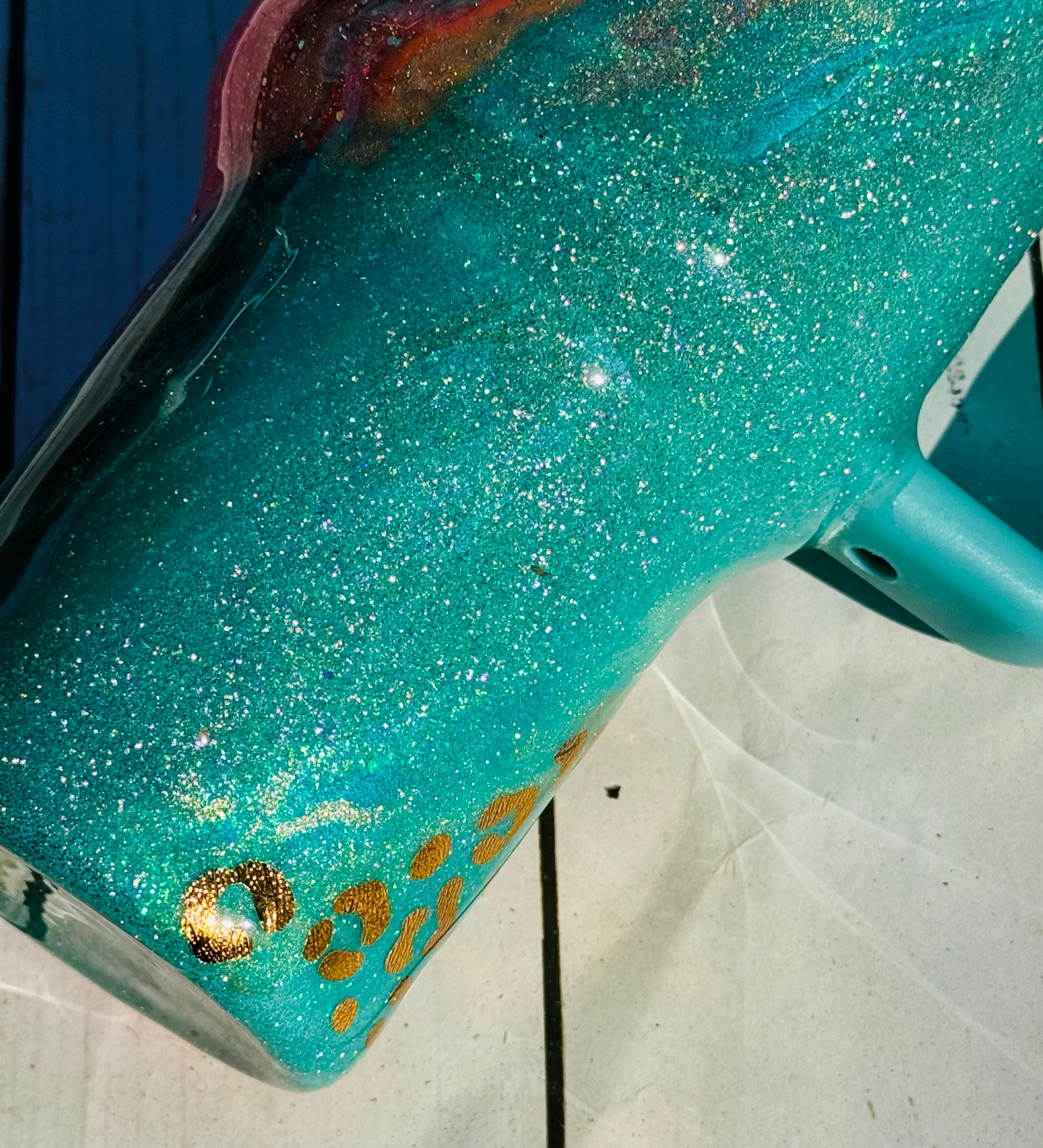 Teal greens and corals! splashed with sparkle and leopard prints! this comes with a straw and lid that slides and sips also!! grab this one of a kind tumbler and stay hydrated!!