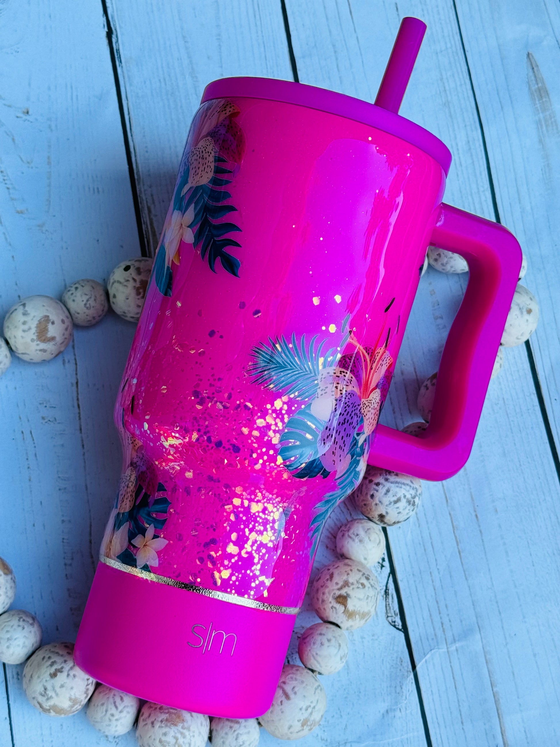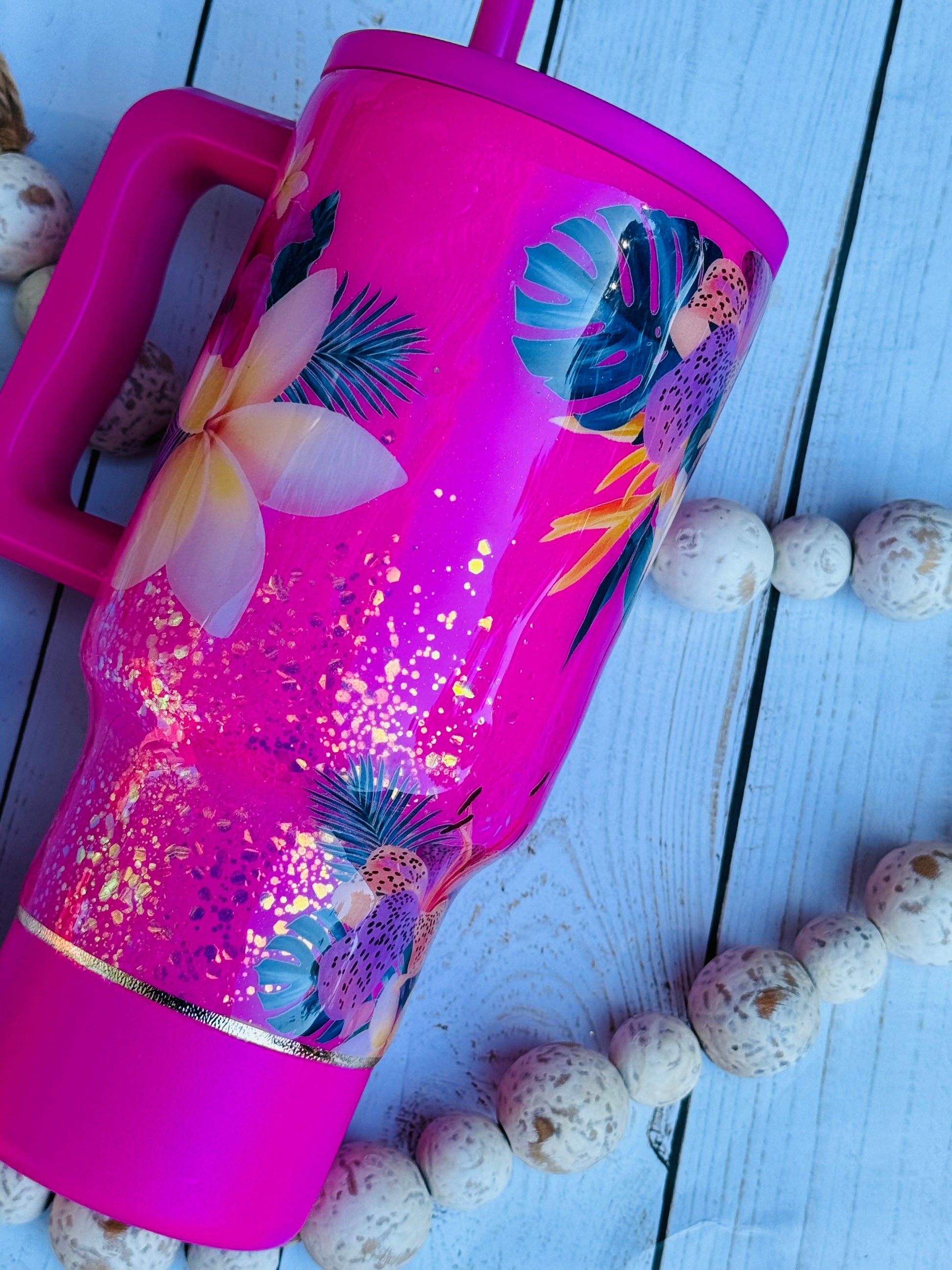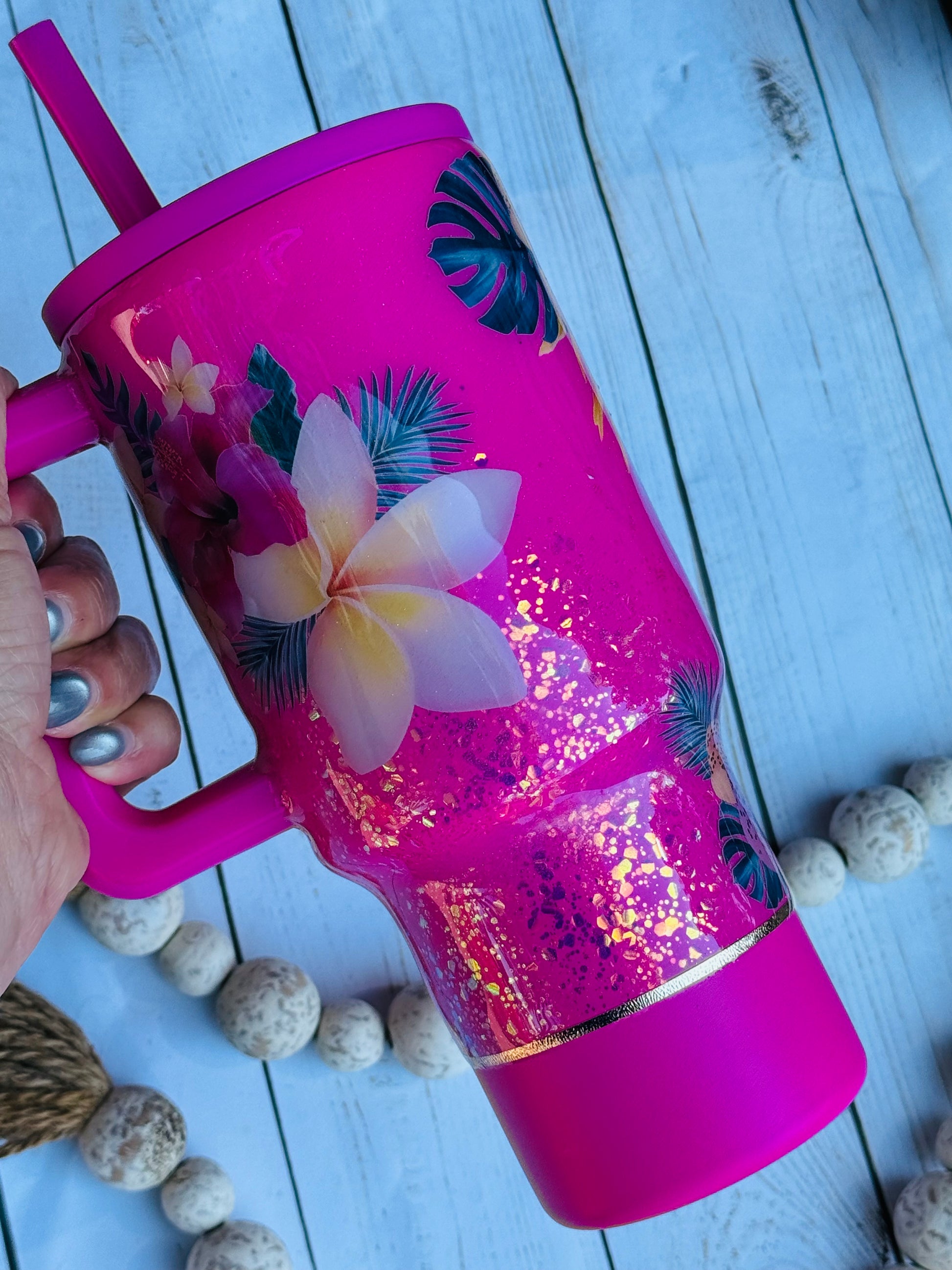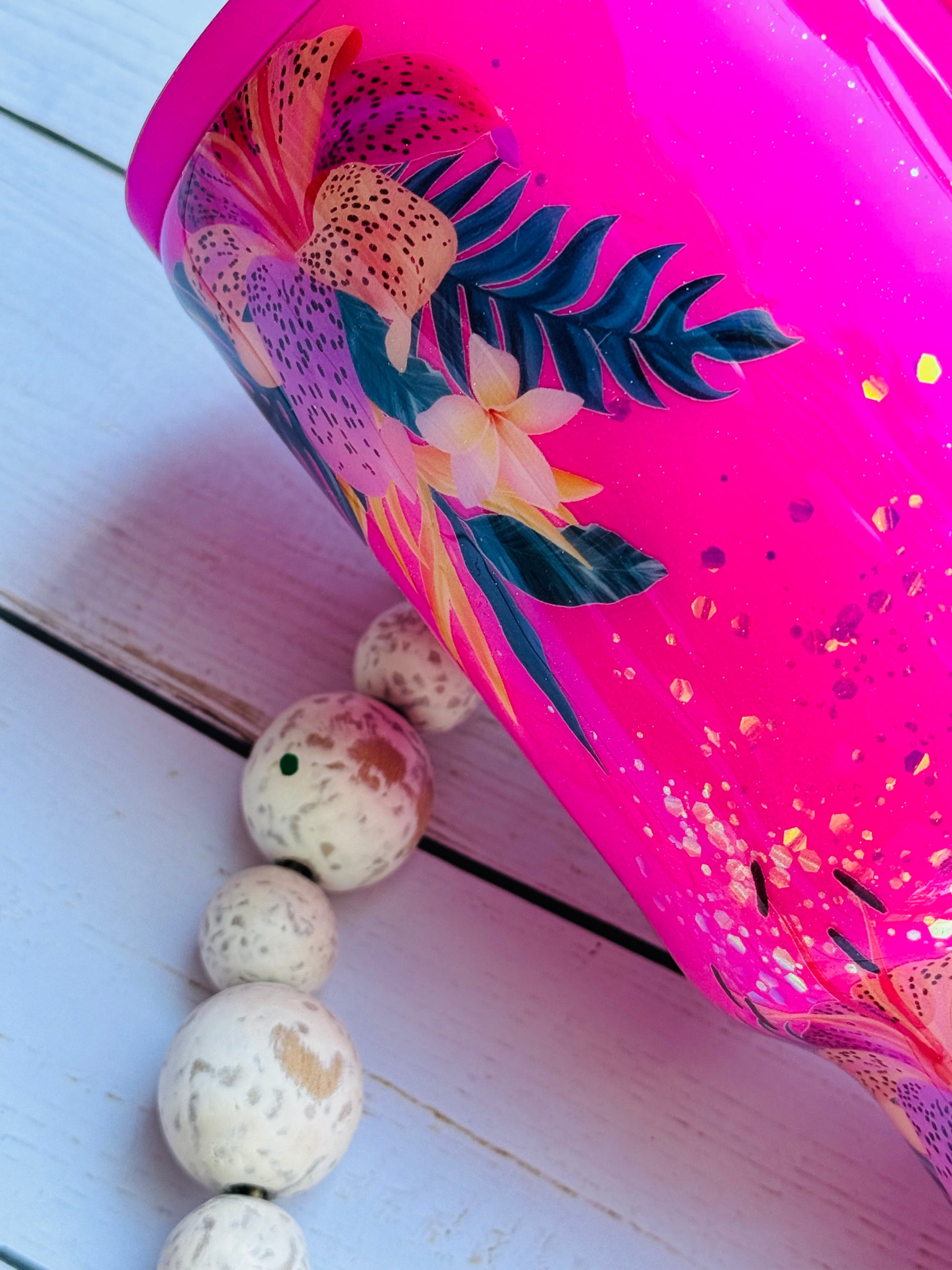 Bursting with colorful florals and pink sparkle, this tumbler will keep you happy sipping out of it all summer long!!